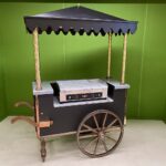 Détails techniques : Plancha intégrée, toit rigide en polyester, frise goutte d’eau, colonnes torsadées en laiton massif, roues en bois avec un cerclage métallique, dessus en inox brossé, éclairage spot LED.